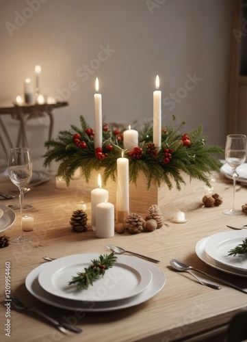 A minimalist Christmas dinner table with a simple centerpiece and candles, rustic elements, minimalist decor