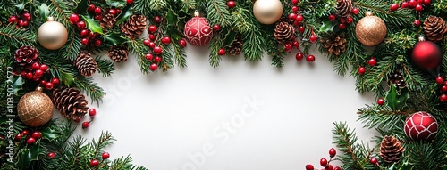 A minimalist Christmas-themed arrangement featuring evergreen branches, ornaments, and holly on a white background, perfect for holiday greetings and festive designs.