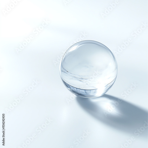 A minimalist clear glass sphere reflecting light in a serene setting.