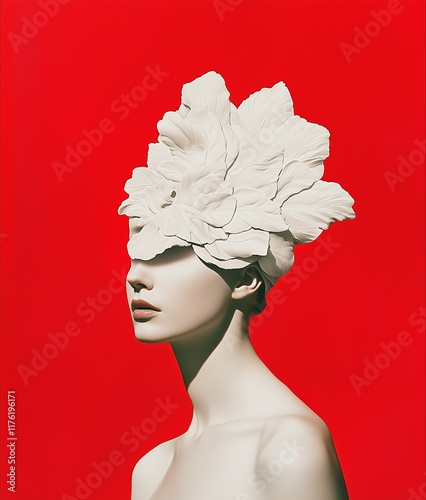 A minimalist collage with an off-white woman's body in the center, wearing a white porcelain Greek statue-like headpiece, set against a red background.
