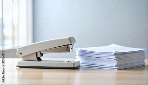 A minimalist composition highlighting a stapler and stack of papers on desktop