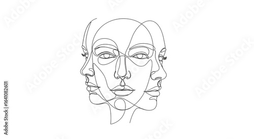 A minimalist continuous one-line drawing of three overlapping female faces.