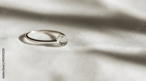 A minimalist glass ring featuring a small round clear glass bead set on a thin silver band lying on a plain white background emphasizing simplicity and purity in design