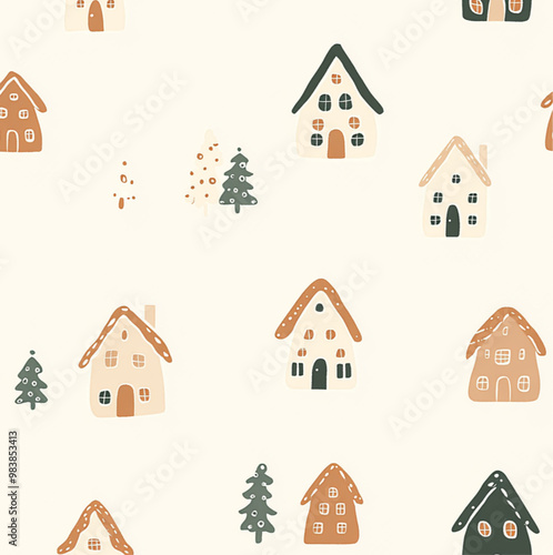 A minimalist handdrawn pattern of gingerbread houses pale colours, cool tones, beige background