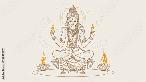 A minimalist line illustration of Goddess Lakshmi on a lotus with glowing diyas. Soft, flowing lines evoke peace, prosperity, and spirituality in a clean, serene design.