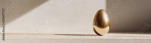 A minimalist scene featuring a shiny golden egg resting on a soft, neutral surface, illuminated by soft light and shadows.