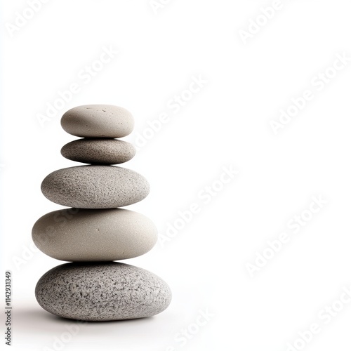 A minimalist stack of smooth stones, symbolizing balance and tranquility against a clean, white background.