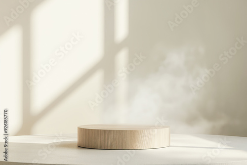 A minimalist wooden display platform on a smooth surface, with soft shadows and a misty effect in the background, creating a serene atmosphere.