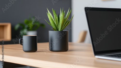 A minimalist workspace featuring a laptop, a small potted plant, and a black coffee mug on a wooden desk.