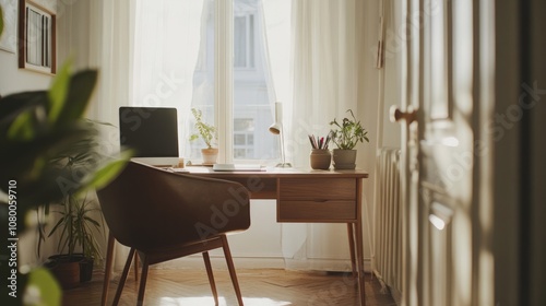 A minimalist writing desk with clean lines, set in a light-filled home office