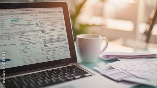 laptop, closeup, document, hot drink, workspace, minimalistic, calm, office, technology, desk, no people, work, paper, home office, setup, modern, lifestyle, productivity, digital, organisation, stationery, relaxing, background, equipment, writing, computer, business
