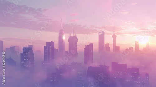 A misty cityscape at sunrise, with tall buildings silhouetted against a soft, pink sky.