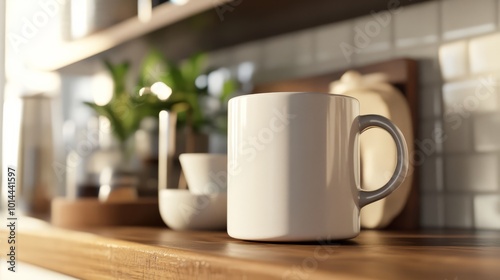 A mockup of a ceramic coffee mug with a blank design, displayed on a cozy kitchen shelf, perfect for beverage branding