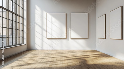 A modern art gallery features large blank canvases against bright, sunlit walls, showcasing a minimalist aesthetic with wooden flooring.