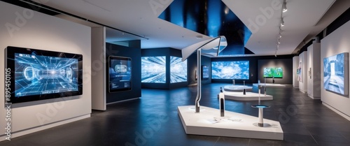 art, gallery, exhibition, technology, design, modern, innovation, creativity, installation, display, digital, contemporary, architecture, museum, ambience, interactive, lighting, layout, aesthetic, visual, space, futuristic, exhibition hall, multimedia, artwork, visitor, life events, sleek, clean, sophisticated, event, presentation, corporate, digital artwork, modern art, high technology