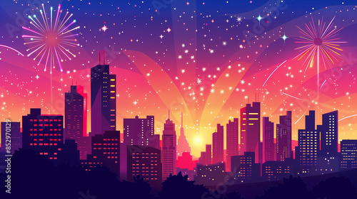 A modern city skyline silhouette with fireworks illuminating the skyline, showcasing urban celebration on Independence Day in a flat graphic style. , independence day of 4th of jul