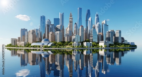 A modern city skyline with tall buildings and skyscrapers reflecting in calm water under a bright blue sky.