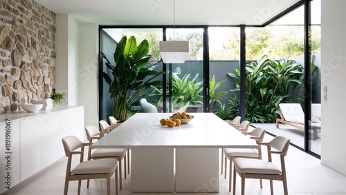 A modern dining room with minimalist design, featuring a stone accent wall with a large window view of green garden outside.
