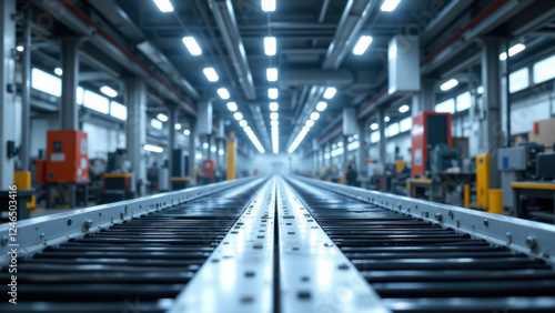 industry, factory, manufacturing, assembly line, machinery, beam, workshop, production, plant, equipment, conveyer belt, illumination, light, ceiling, infrastructure, construction