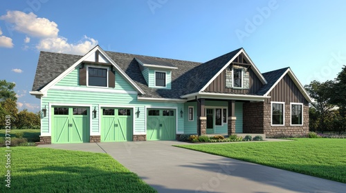 a, modern, farmhouse, home, sporting, cool, mint, siding, dark, chocolate, stone, accent, warm, grey, shingle, roof, information technology, feature, garage, green, double, door, left, taupe, concrete, driveway, 2, car, yard, covered, bright, lime, grass, adding, fresh, pop, colours, house, illustration, image, landscape, retro, street, town