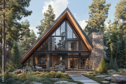 modern, forest, house, triangular, roof, large, a, window, stone, chimney, tall, pine, tree, lush, greenery, natural, light, illuminating, interior, serene, peaceful, atmosphere, architectural, photo, environmentally friendly, design, contemporary, retreat, living, concept, minimalist, landscaping, stylish, tranquil, sustainable, inviting, elegant, scenic, cosy, radiant, unique, bright, clean, organic, rustic, harmonious, inspiring, countryside
