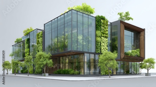 A modern, glass-fronted building with a green roof and lush greenery on the facade, set against a neutral background with a few trees.