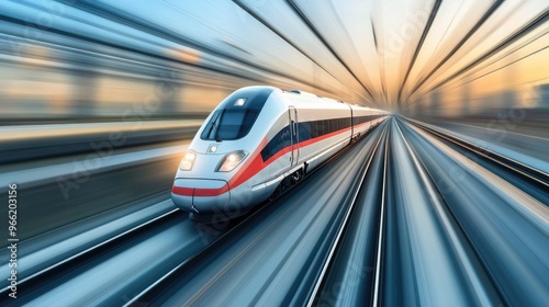 A modern high-speed train zooming along newly laid railway tracks, with a focus on the sleek train and the smooth, well-maintained track infrastructure.