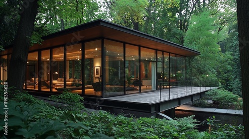 A modern home with expansive glass walls, nestled amidst natural greenery, showcasing minimalist design and tranquility