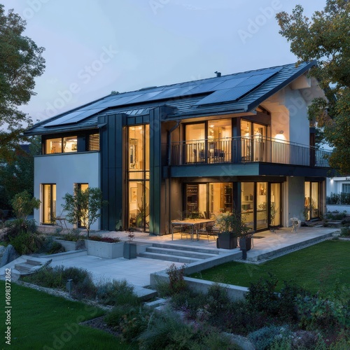 A modern home with large windows, solar panels, and a stylish design, set in a landscaped garden during twilight.