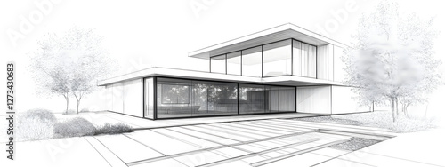 A modern house with large windows and an exterior of glass walls, sketched in an architectural drawing style