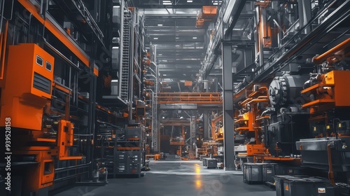 A modern industrial warehouse with orange accents and machinery.