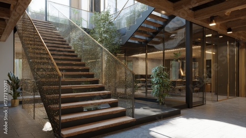 A modern interior with staircase, plants, and glass walls creating a bright space.