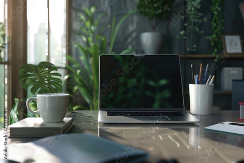A modern laptop computer placed on a wooden desk. Suitable for technology and workspace concepts