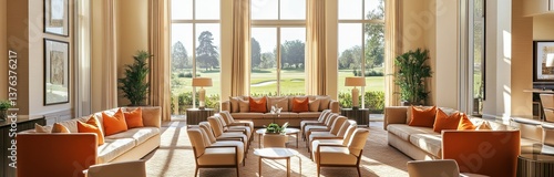 A modern living room scene, a spacious living room with orange sofas and chairs, orange cushions, a glass coffee table in the center, large floor-to-ceiling windows in the background