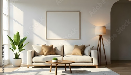 A modern living room with a beige sofa, wooden coffee table, and potted plant on a side table. The room has white walls and natural lighting coming in from a window
