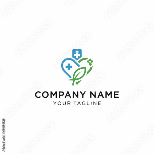 A modern logo design featuring a heart shape combined with a medical cross and a green leaf, symbolizing health, nature, and care, with placeholder text for company name and tagline.