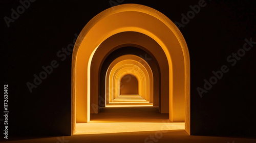 A modern minimalist golden archway stands out in a pitch-black environment, softly illuminated, creating a striking contrast and an elegant focal point in the darkness.