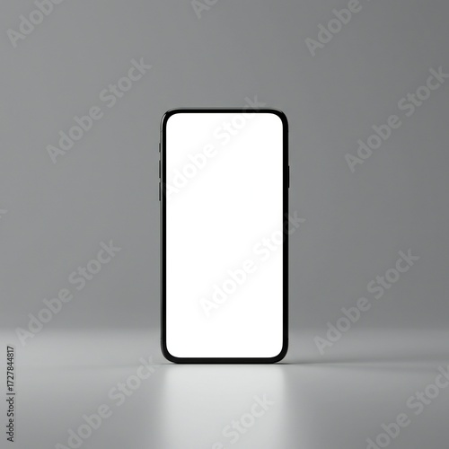 A modern smartphone with a black glossy finish, blank white screen, soft gray gradient background, smooth textures, and diffused lighting. No visible text or additional objects.