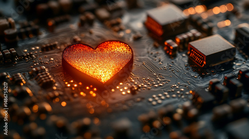 A modern, solid, shiny golden heart resting on a dark circuit board, symbolizing technology meeting emotion, innovation, and digital connectivity, with space for caption on the side.