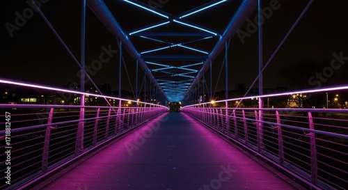 A modern steel bridge bathed in vibrant, vibrant magenta and azure LED lights creates an enchanting urban nighttime scene.