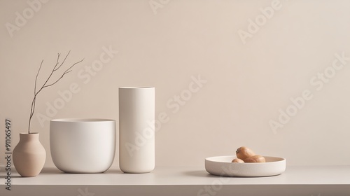 A modern still life with tamarind fruits and minimalist ceramics. Neutral tones with a focus on simplicity and elegance