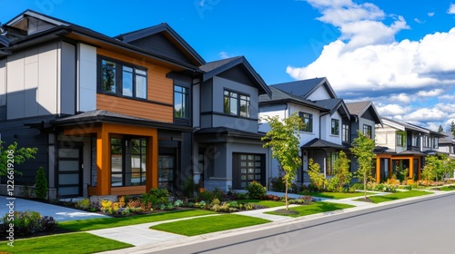 A modern twin house community, with a row of homes showcasing clean lines, contemporary design, and matching facades.