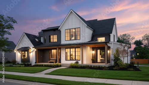A modern two-story house at dusk with contrasting colors and landscaped garden. Perfect for real estate listings, architectural journals, or suburban lifestyle blogs