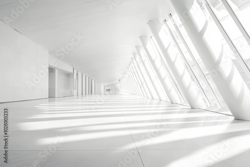 A modern white hallway with slanted beams and large windows allowing sunlight to cast shadows creating an open and bright space