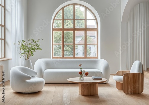 A modern white living room with a light blue armchair, a large window, and a wooden floor.