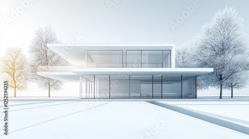 A modern white villa with large windows and a glass facade, in a minimalist style