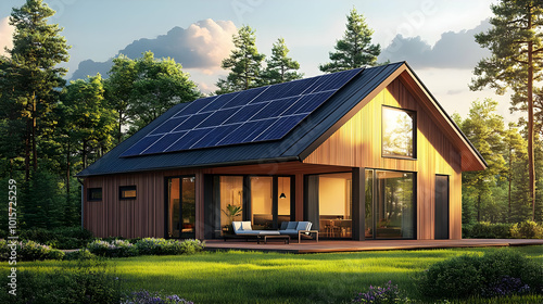 A Modern Wooden House with Solar Panels on the Roof Surrounded by Trees in a Forest Setting