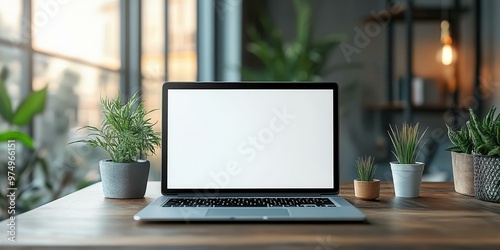 A modern workspace featuring a laptop on a wooden desk surrounded by potted plants and natural light, ideal for creative inspiration.