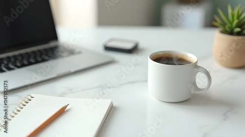 workspace, laptop, notebook, crayons, hot drink, coffee cup, modern, home office, office, productivity, relaxation, business, lifestyle, morning, afternoon, sharpened, inspiration, calm, quiet, minimalist, clean, organised, simple, freelancer, entrepreneur, white, grey, brown, closeup, natural light, morning light, hot drink, steam, hot coffee, motivation, contemporary, technology, device