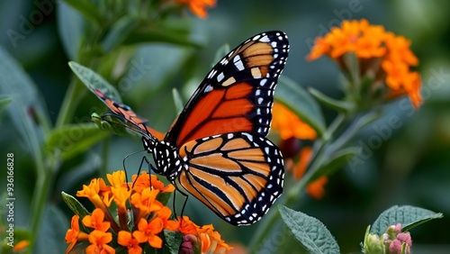 A monarch butterfly is perched gracefully on bright orange flowers.
